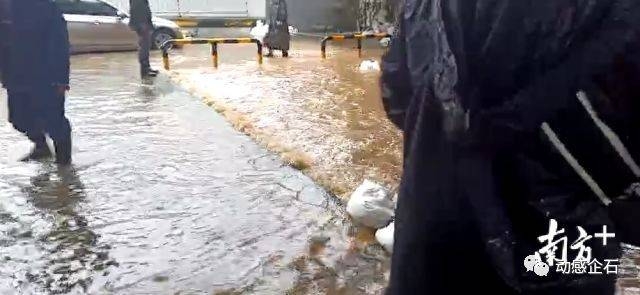 水已到达记者膝盖位置,已经有水流向居民区,现场工作人员正准备让居民区人员撤离。