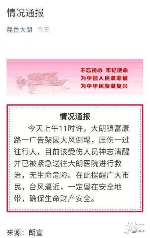 16日上午,网络有人称东莞有广告架倒塌砸死行人。大朗镇通报,今天上午11时许,大朗镇富康路一广告架因大风倒塌,压伤一过往行人,目前该受伤人员神志清醒并已被紧急送往大朗医院进行救治,无生命危险。在此提醒广大市民,台风逼近,一定留在安全地带,确保生命财产安全。