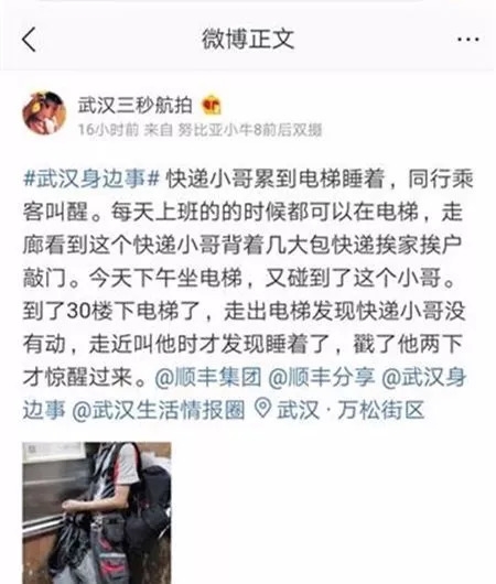 据拍摄这张照片的网友介绍,自己在汉口万松街一大厦内上班,平时经常遇到顺丰的一位快递小哥,每次都是背着几大包快递,挨家挨户去敲门送件。