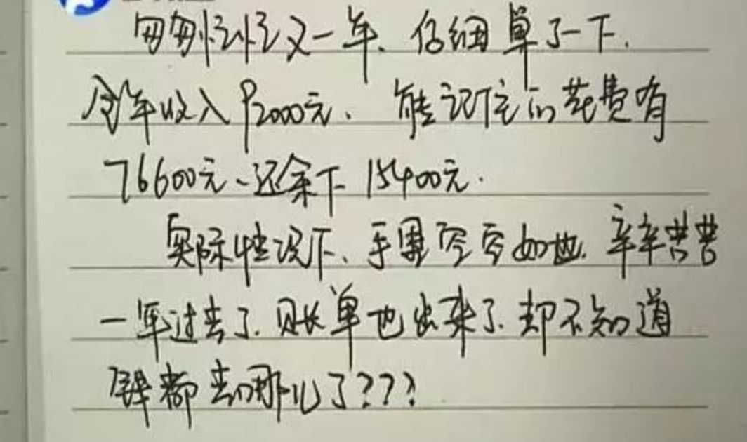 郑州一辆公交车上,发现了一本遗失的笔记本。翻开笔记本,上面密密麻麻记录着一年的收支,母亲看病的花费、走亲戚、日常开支……辛苦一年,真的没剩下多少钱。