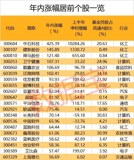 分析年内上涨个股发现,基本面良好或是股价上涨的催化剂之一。整体来看,上涨个股平均涨幅高达142.98%,远远超过同期A股整体水平。此外,上涨个股中,252只个股今年上半年净利润实现同比增长,占比近87%。具体来看,中石科技、海普瑞、鲁亿通、苏宁易购、国际医学、通源石油与建新股份等个股上半年净利润同比增长超10倍,其中化工股中石科技今年以来股价上涨425.39%,上半年净利润同比增长超100倍。