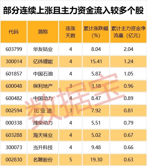 值得注意的是,298只连续上涨个股中,3只个股期间主力资金累计净流入超过亿元。其中,累计资金流入最多的为华友钴业,主力资金累计流入2.04亿元。