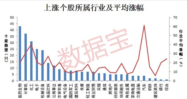 分行业来看,上涨个股主要分布于医药生物、计算机、化工、电子、机械设备、食品饮料与公共事业七大板块,占比达64.14%。以行业平均涨幅来看,汽车、化工、计算机、食品饮料、综合与交通运输等行业涨幅均超20%,高于行业整体平均水平。