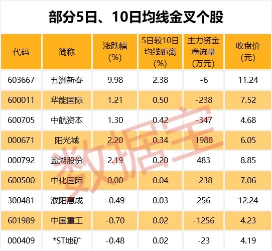 最新数据显示,有9只A股的5日均线主动上穿10日均线,其中五洲新春、华能国际、中航资本等个股的5日均线较10日均线距离最大,分别达2.38%、0.5%、0.42%。