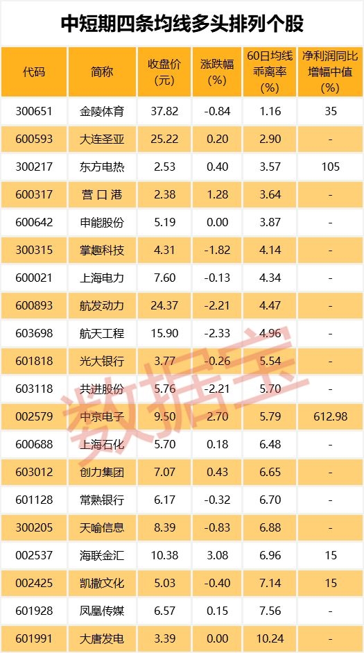 一般来说,均线多头排列代表买方力量强大,后市由多方主导行情概率较大。最新数据显示,37只个股5日、10日、20日、60日四条均线近日呈多头排列。其中金陵体育、大连圣亚、东方电热股价与60日均线的乖离率最小,分别为1.16%、2.9%、3.57%。