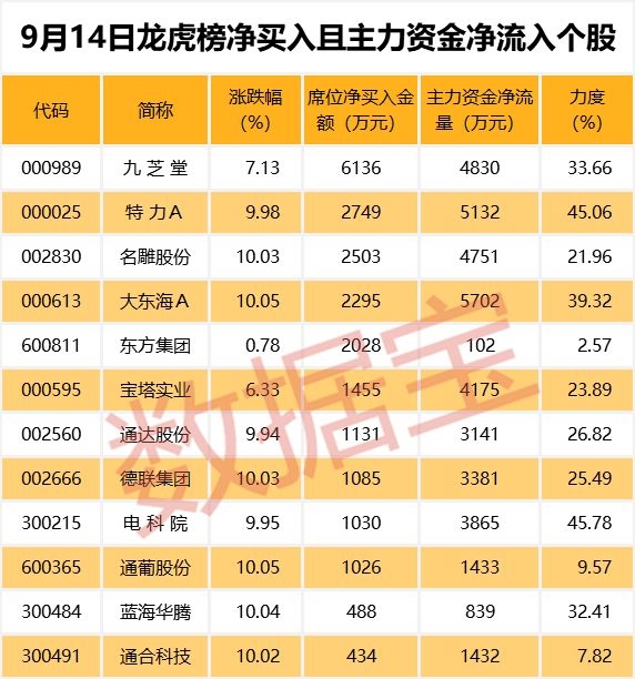 9月14日龙虎榜中机构及营业部席位资金净卖出4.59亿元,其中净买入的个股有13只;净卖出的个股有17只。净买入前三名个股分别是九芝堂、特力A、名雕股份,净买入金额占当日成交额比例达42.75%、24.14%、11.57%。