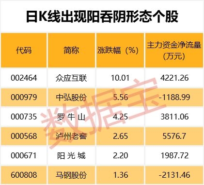 最新数据显示,两市共有6只个股日K线出现阳吞阴形态,当天涨幅最大的是众应互联、中弘股份、罗牛山,涨幅分别为10.01%、5.56%、4.25%。