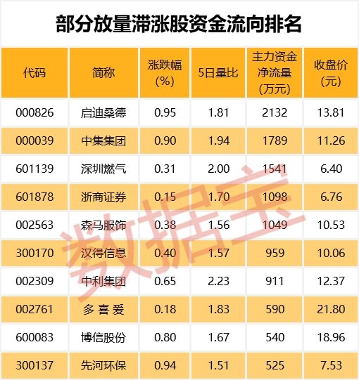 值得注意的是,80只放量滞涨股中,启迪桑德、中集集团、深圳燃气等个股主力资金净流入最多。