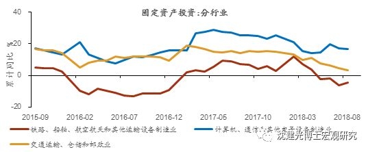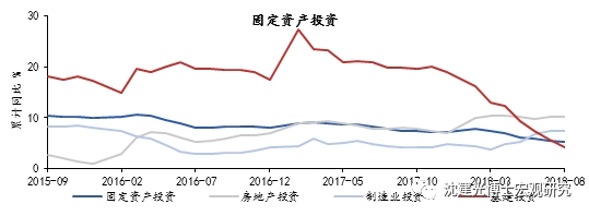 1-8月,固定资产投资同比增长继续回落至5.3%,是1992年以来的新低。其中,基建投资是主要拖累,1-8月基础设施投资同比增长4.2%,拖累投资增长。铁路投资仍然是负增长,显示虽然当前基建投资是主要发力点,但政策落地仍有时滞,基建投资下滑的态势并未扭转。制造业投资增速有所反弹,主要体现在高端制造业增速较快,其中,专用设备制造业投资、计算机、通信和其他电子设备制造业增速分别为12.1%和16.6%。