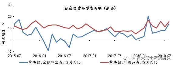 8月社会消费品零售总额同比增长9%,增速比上月加快0.2个百分点;其中,高端奢侈品消费增长较多,体现在金银珠宝类增速同比14.1%;房地产相关消费仍然不错,建筑及装潢材料、家具消费同比增速为7.9%和9.5%,家电消费有所回升;手机等通讯消费回落明显,日用品消费增加。汽车消费仍然低迷,比7月进一步回落。