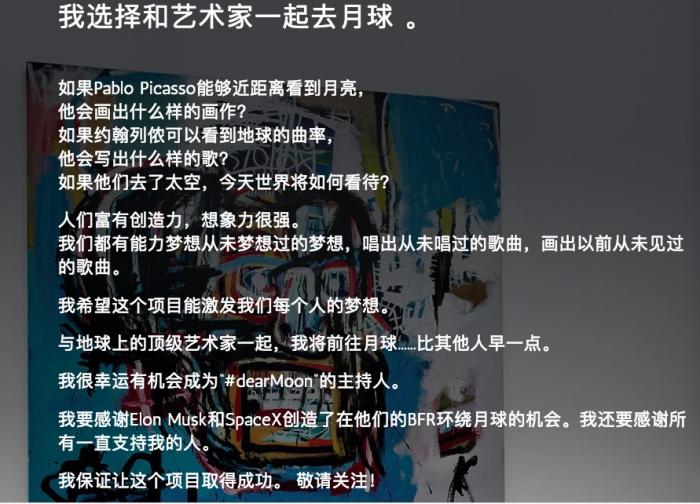 为了此次月球旅程,前泽友作发起了一个名为dearMoon的艺术项目,邀请8位艺术家和他一同前往月球。他在Twitter上对dearMoon项目做出了说明: