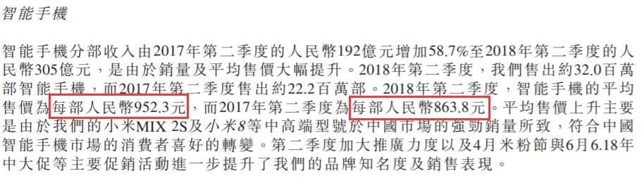 这不仅是感觉,而且也有实在的数据支撑。今年8月,小米披露的上市后首份财报显示:2018年第二季度,小米手机的平均售价为每部人民币952.3元,而2017年第二季度为每部人民币863.8元。
