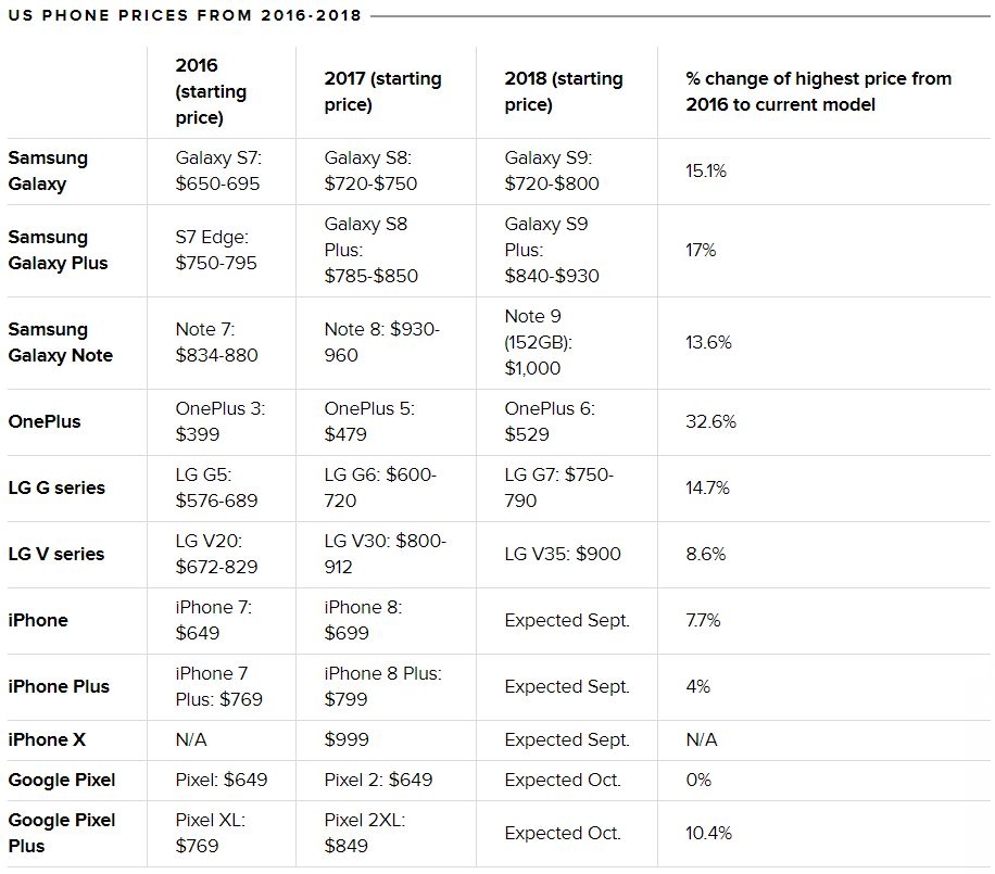 不久前,美国著名科技媒体CNET还给出一份统计数据:2016年至今,三星Galaxy S系列的售价(在美国的售价)已经飙升15.1%,LG G系列的价格上涨14.7%,华为P系列的定价上涨了33%。