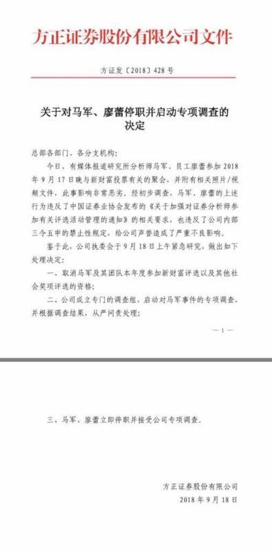 与此同时,方正证券表示,研究所分析师马军、员工廖蕾参加与新财富投票有关的聚会,并附有相关照片和视频,此事影响非常恶劣,不仅违反了中国证券业协会发布的《关于加强对证券分析师参加有关评选活动管理的通知》,也违反了公司内部三令五申的禁止性规定。经过研究,决定取消马军及其团队本年度参加新财富评选以及其他社会奖项评选的资格,对马军、员工廖蕾立即停职并启动专项调查,并根据调查结果,从严问责。