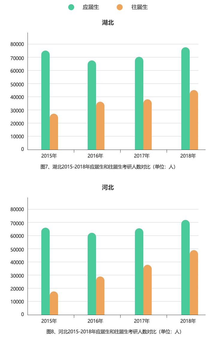 以下是湖北、河北应届生和往届生的增长趋势对比图。