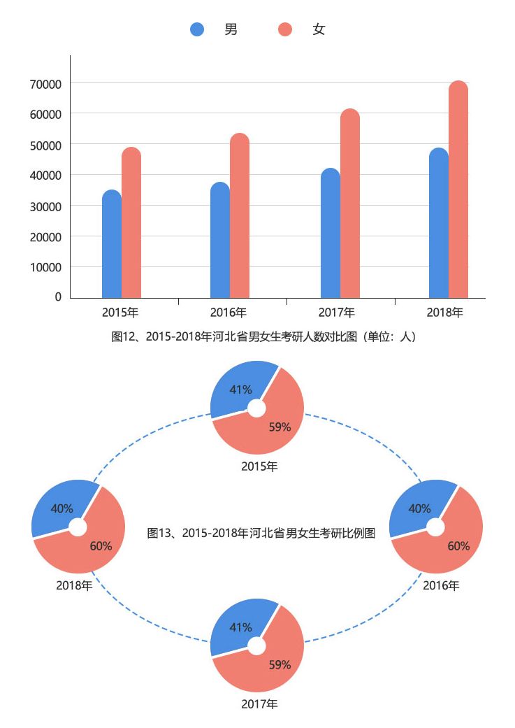 硕士研究生招生规模不断增长的同时,女生考取研究生的比例不断提高,女生成考研群体主流。下面,以河北省为例: