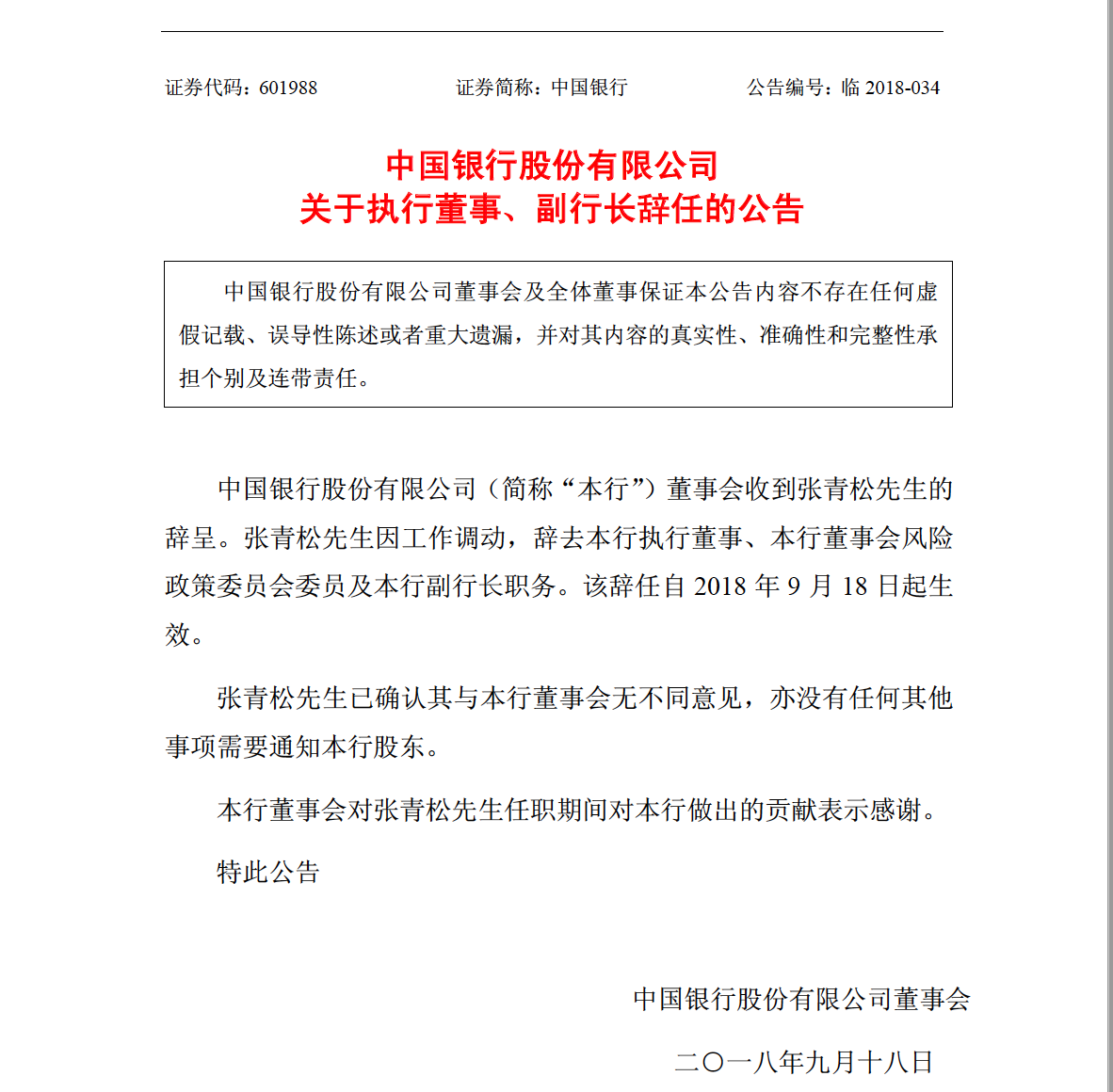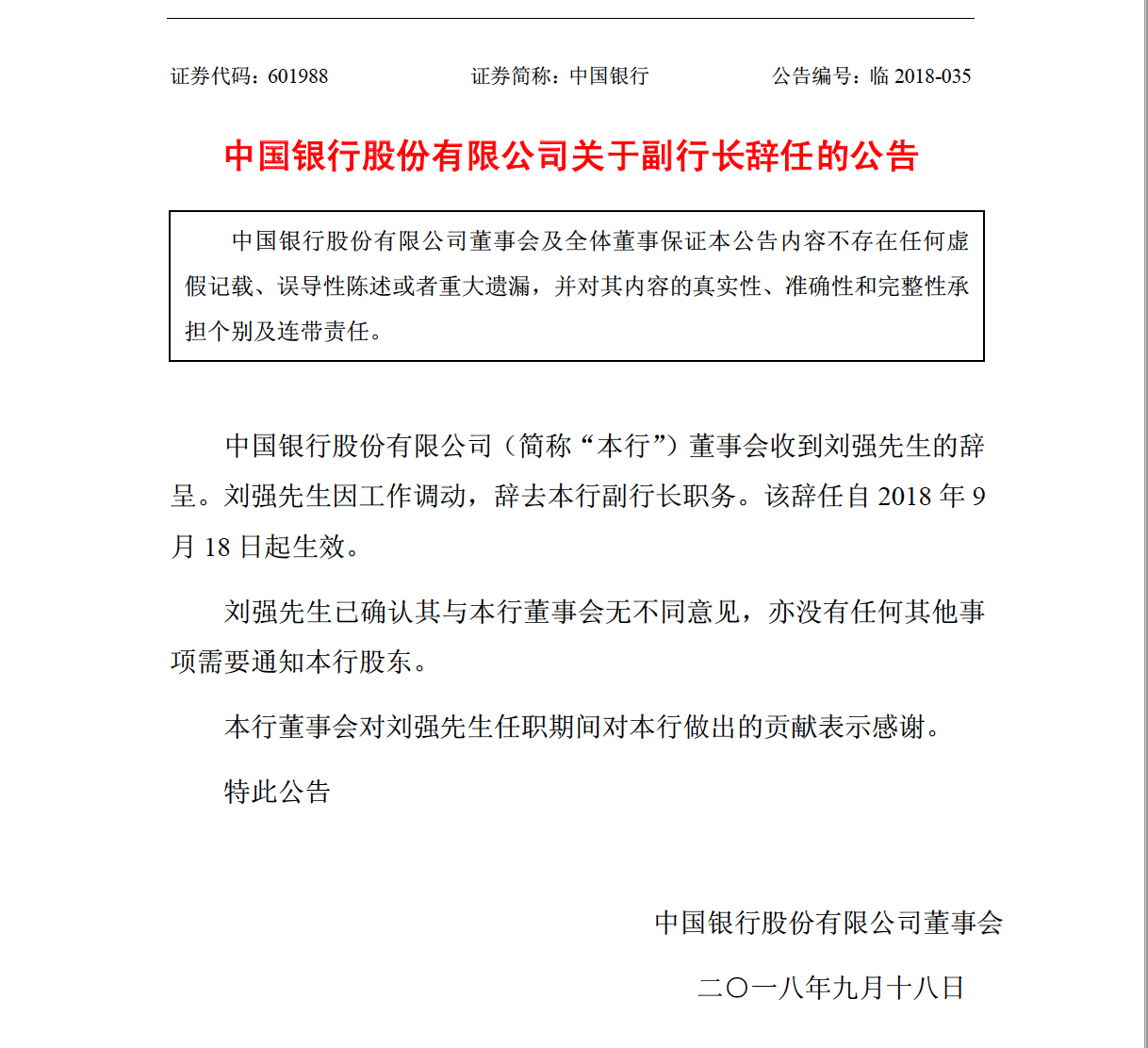 9月18日,中国银行发布刘强、张青松两位副行长的辞任公告。