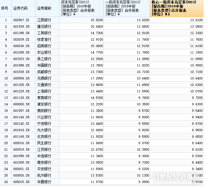 2018年上半年,上市银行资本充足率多降少升,华夏银行、平安银行、南京银行和杭州银行的核心一级资本充足率只高于监管红线不足1个百分点。