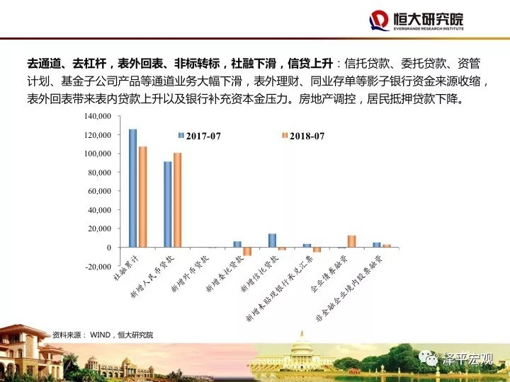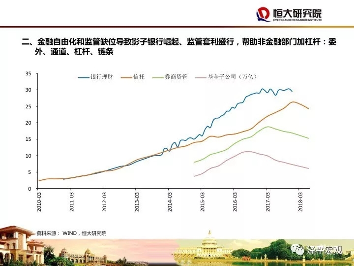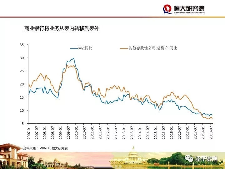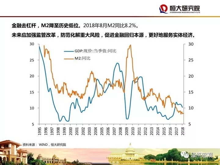 第二点我想讲从金融层面,在过去金融自由化和监管缺位导致了影子银行的崛起和监管套利,帮助了非金融部门的加杠杆。商业银行将大量业务从表内转移到表外。现在中央政府决心去杠杆,列为三大攻坚战之首,也是供给侧结构性改革的五大任务之一,我们在一系列的政策措施下,看到了形势的逆转,也就是表外的回表和非标的转标。可以看到广义货币供应量降到历史新低,过去年均M2增速是15%,今年8月份下降到8.2%。未来,我们应该加强金融监管改革促进金融回归本原,更好服务实体经济。