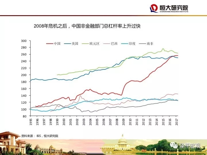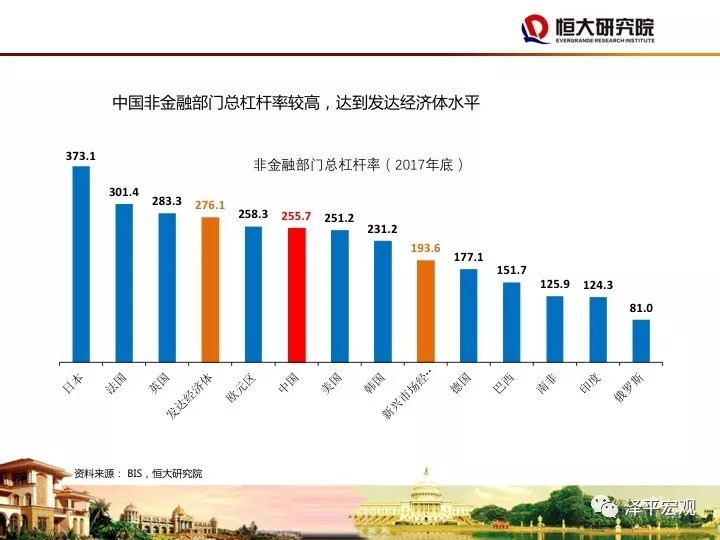 众所周知,中国的高杠杆集中在三大部门,国企、地方政府、房地产部门。在过去10年,中国的整个宏观杠杆率出现了过快上升。在全球比较来看,也是处在一个较高的水平。