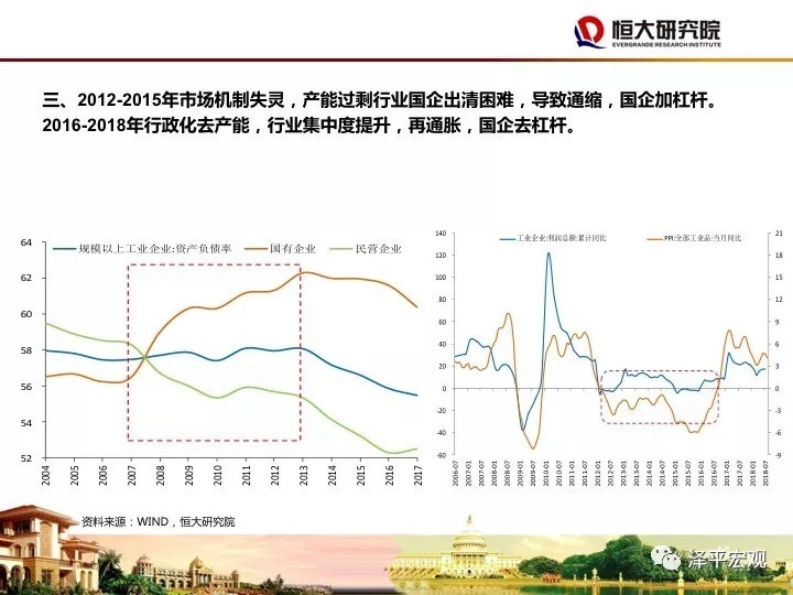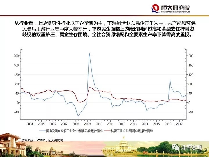 第三点是关于国企的杠杆问题。2012-2015年,市场机制失灵,我们看到产能过剩行业国企出现出清困难,导致通缩,利润恶化,国企出现了大幅度加杠杆。我们采取的行政化和市场化相结合来共同去杠杆。这两年我们看到了形势逆转,行业集中度提升,再通胀,国企利润大幅改善,国企开始去杠杆。但是值得重视的是,从行业分布来看,上游是以国企垄断为主,下游是以民企竞争为主,我们看到上游的集中度进一步提升,下游的民营企业面临上游涨价,利润过高,和金融去杠杆融资歧视的双重挤压,需要高度重视民企生存困境、全社会资源错配和某些领域的全要素生产率下降。这张图清晰展示了长期以来民营企业因为更好的治理,更高的效率,利润长期高于国企,但是这几年出现逆转。这种方式相当程度上不是通过市场竞争来实现的。