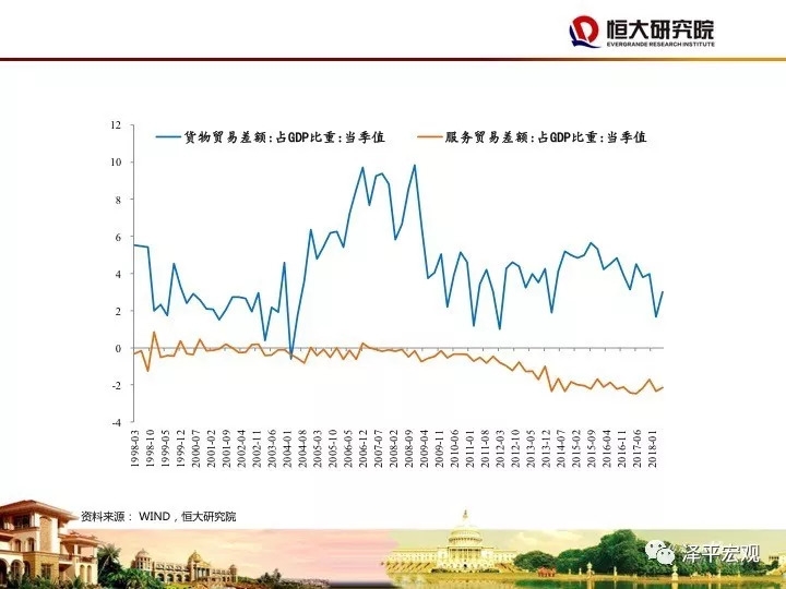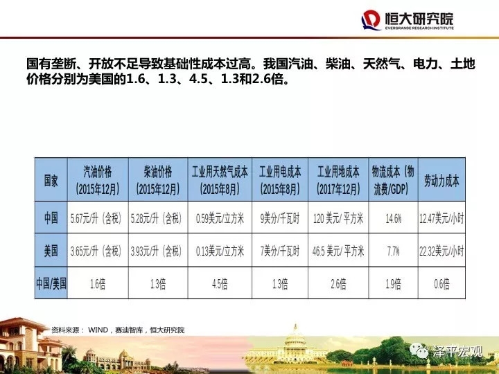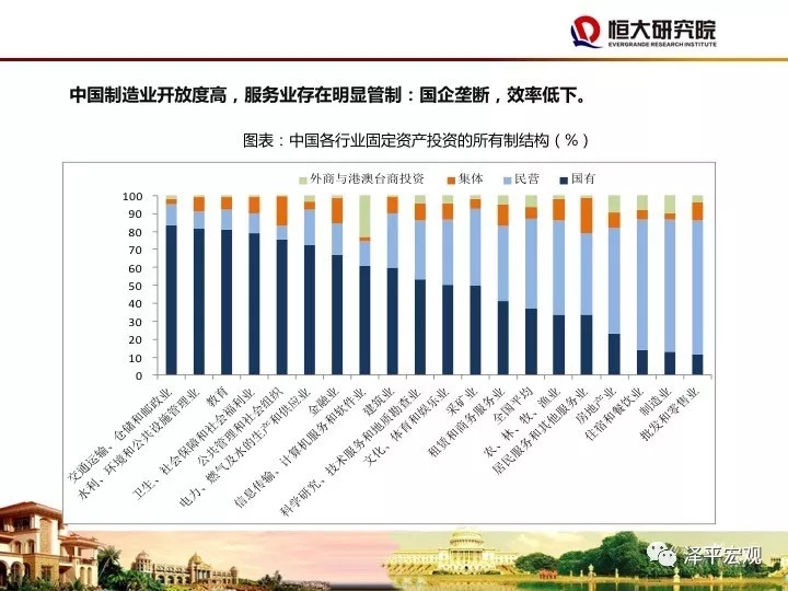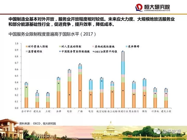 因为垄断,因为开放不足,我们看到基础性成本过高,我国在汽油、柴油、天然气、电力、土地等方面基础性的成本高于美国。中国制造业是开放程度比较高的,国有比重在制造业只占10%,民营企业和外资企业加起来占80%以上,我们看到中国的制造业取得了巨额的贸易顺差,这是竞争力的体现。但是与此同时服务业存在大量的管制,国有比重高达70%、80%以上,效率低,存在贸易逆差。从国际来看,中国服务业也是存在着某种程度的投资限制,所以按十九大报告提出来的未来要满足人民美好生活的需要,一个正常的推理是未来应该大力度大规模放活中国的服务业和部分能源的基础性行业,促进竞争,提升效率,降低成本。