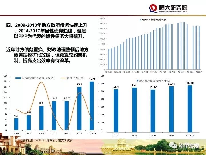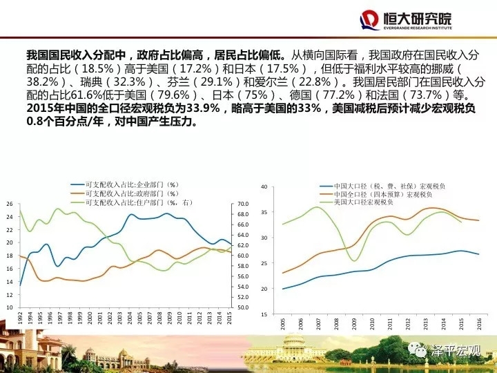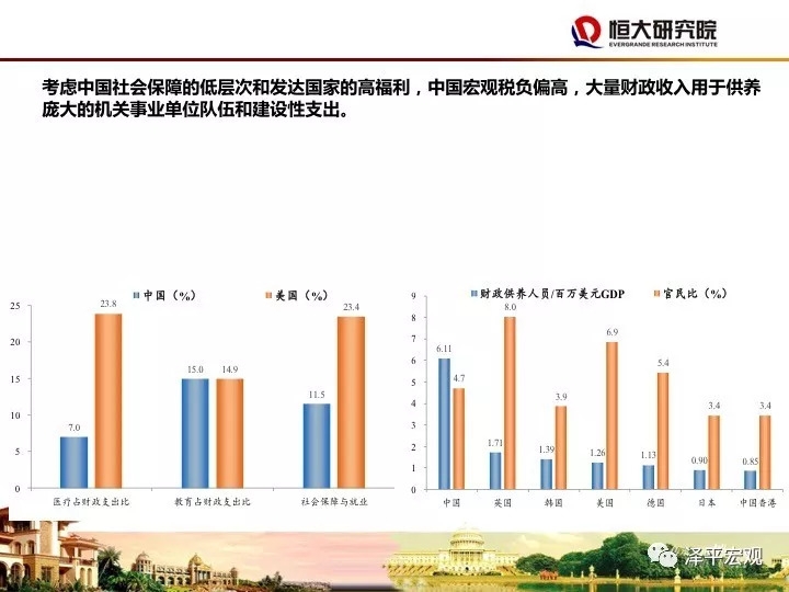 第四点是关于地方政府的杠杆问题。2009-2013年地方债务大幅上升,2014-2017年,显性的地方债务趋稳,但是PPP代表的隐性债务大幅飙升。近年来,地方政府的债务规模放缓,但是预算软约束和支出效率改革有待推进。可以看到为什么中国的地方债务不断膨胀,一方面刚才讲到软约束的问题,还有一个支出刚性和低效率问题。我们知道国民收入分配当中政府的占比偏高,居民偏低,政府占有了大量的国民收入,但是我们在社会保障方面的支出、医疗教育支出低于发达国家的水平。非常清晰的推理是宏观税负高,政府的收入占比高,大量的财政收入用于基建收入和财政供养。我们看到我国单位GDP的财政供养是偏高的,有待于推进改革。