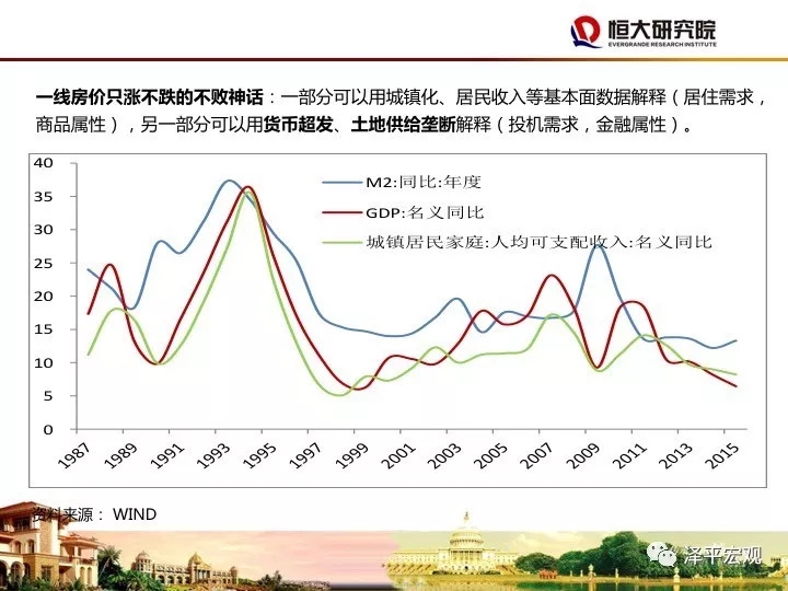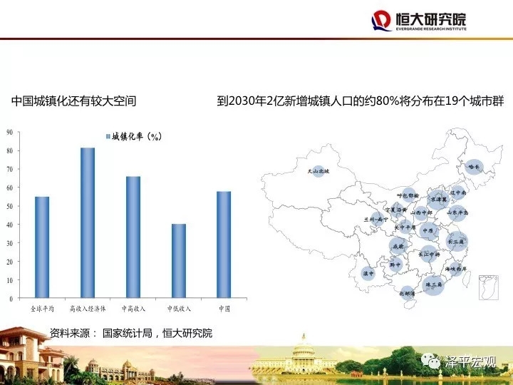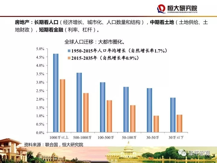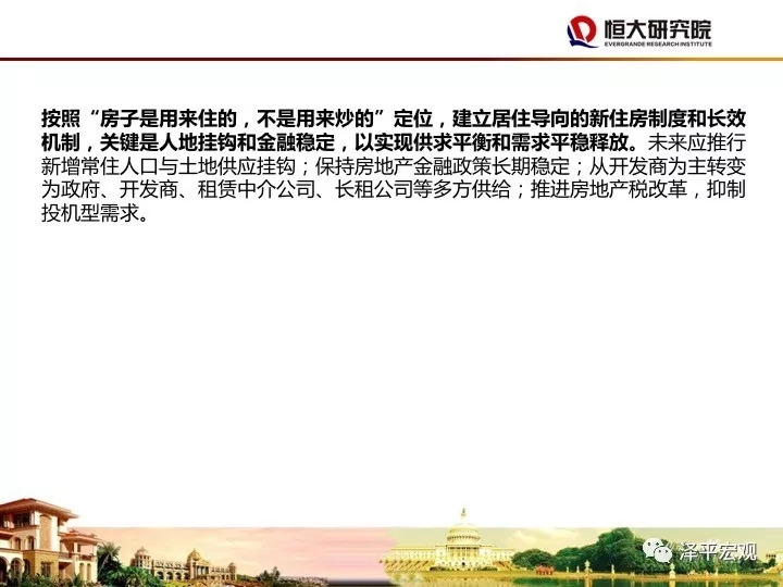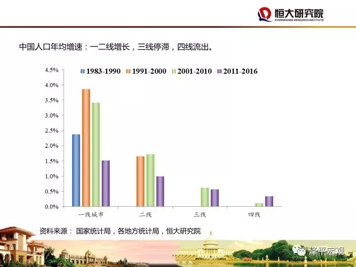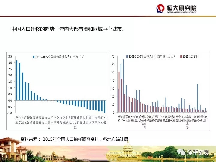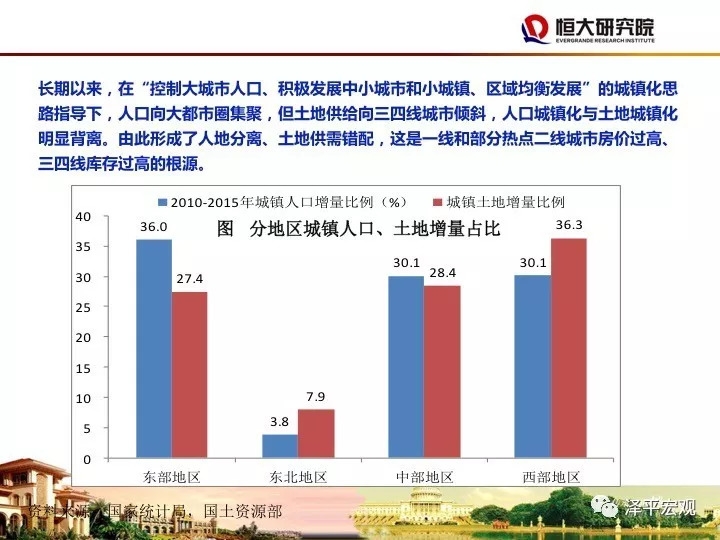 最后是房地产的杠杆。这个很关键而且存在广泛的误解。过去房地产在涨价预期和货币刺激下大幅加杠杆,居民负债增加,出现了一定消费挤出。关于房地产的杠杆是怎么形成?这里有深层次的体制机制问题。我研究了十多年的房地产,关于房地产,我们曾经提出过业内的一个标准的分析框架也是广为流传的,就是长期看人口、中期看土地、短期看金融。人口是需求,土地是供给,金融是杠杆。无论是美国、欧洲、韩国,还有联合国的数据,百年来的历史数据告诉我们,人在往都市圈迁移,因为都市圈更有活力,有效率,节约资源和土地。中国一二线城市都市圈人口增长,三线停滞,四线流出,中国的人口向大的都市圈迁移,这个过程还远远没有结束。但是,在过去长期以来,我们在控制大城市人口规模、积极发展中小城市和区域化均衡发展的城镇化思想指引下,人口向都市圈集聚,土地供给向三四线倾斜,人口城镇化和土地城镇化背离,造成了人地分离、供求错配,这是导致一二线高房价和三四线高库存的根源。所以事实清晰的告诉我们,所谓的房地产长效机制,我认为关键是人地挂钩和金融稳定,以实现供求平衡和需求的平稳释放。