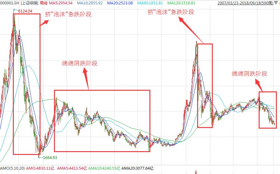 2013年A股:在2013年之前,A股经历两轮大级别调整:第一阶段为2007年10月6124.04点开始至次年1664.93点的急跌,这轮下跌跌势惨烈,跌幅超过70%,耗时仅约一年,可谓是快速“去泡沫”阶段;另一阶段为2009年开始(另有观点认为是从2011年开始)的绵绵阴跌,调整幅度虽不如前一阶段大,但调整时间长。
