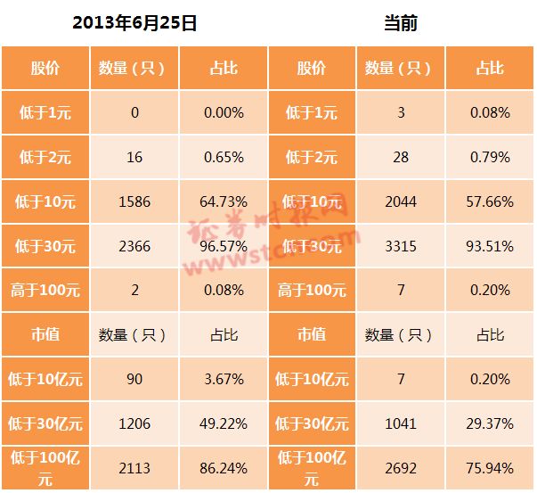 如2013年6月25日,低于2元股票数量占A股股票数的比例为0.65%,低于10元股票数量占A股股票数的比例为64.73%;当前低于2元股票数量占A股股票数的比例为0.79%,低于10元股票数量占A股股票数的比例为57.66%。