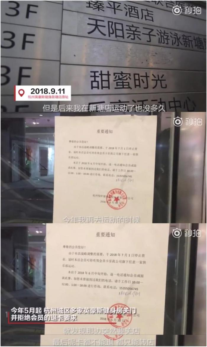 据浙江新闻报道,杭州一家名为“英豪斯”的连锁健身房,部分门店在经营了数月后突然歇业,贴出一纸告示后人去楼空。