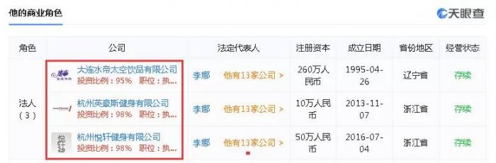 此外,“英豪斯”的法人李娜旗下还有13家公司,其担任法人的除了英豪斯还包括另外一家健身房:杭州悦轩健身有限公司。