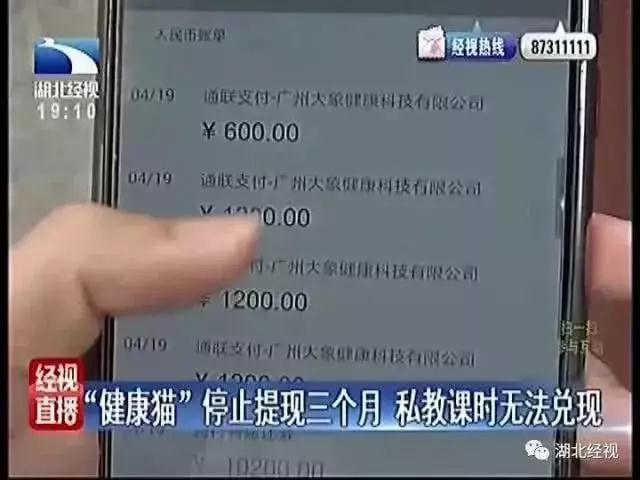 以此类推,25万体院学生老师,每人负债数十万,想着发财梦。不料却在今年5月,健康猫出现无法提现的危机。8月27日,“健康猫”终于被警方定性为“非法吸收公众存款”。