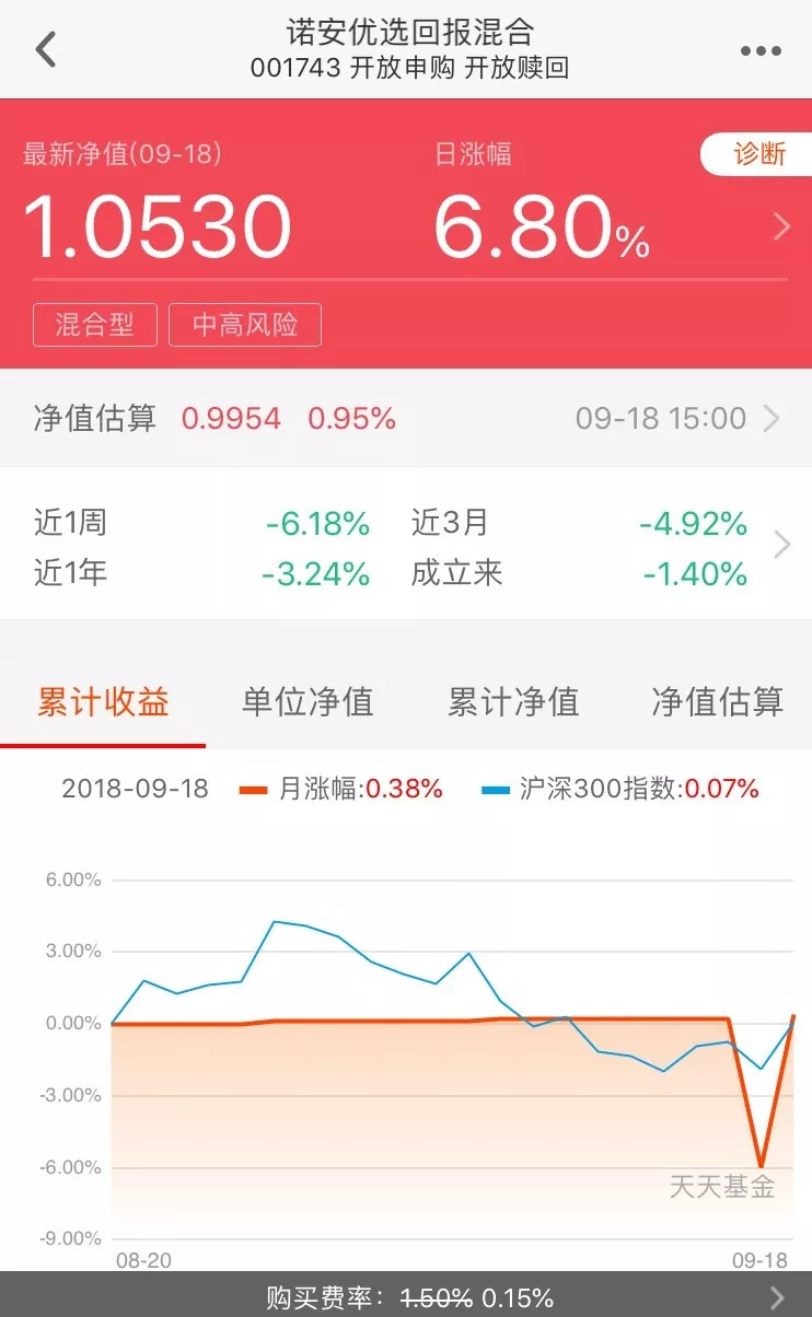 然后回到文章开头一幕,前天(9月17日)暴跌6.18%,成为跌幅最大的基金;昨日(9月18日)暴涨6.8%,成为涨幅最大的基金。