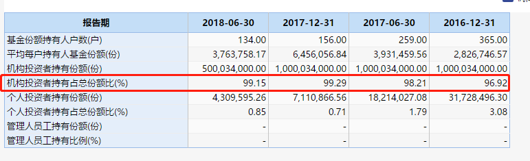 而最新的二季度机构持仓占比高达99.15%,并且该基金今年上半年已经出现机构大举赎回5亿份,个人投资者仅持有430.96万份。