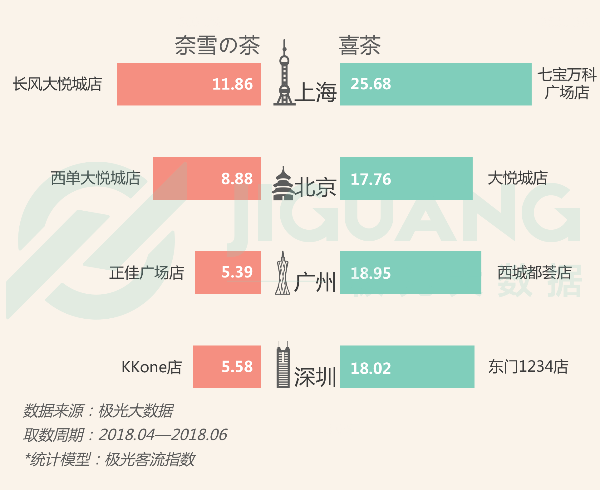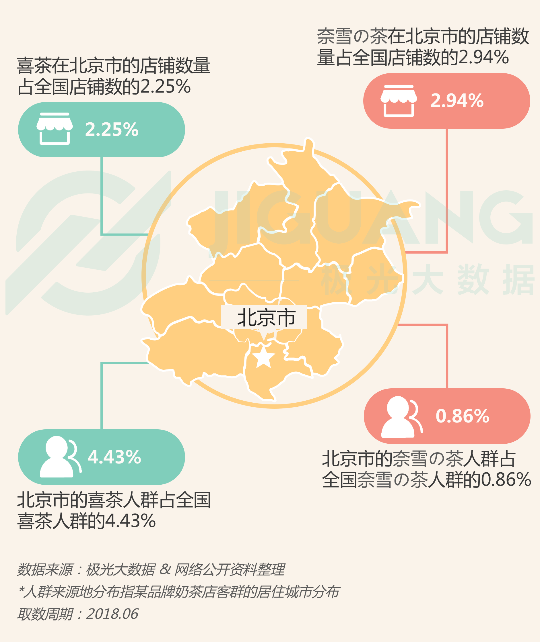 根据极光大数据统计,喜茶北京店铺数量仅占全国2.25%,但收获了全国4.43%的喜茶人群。