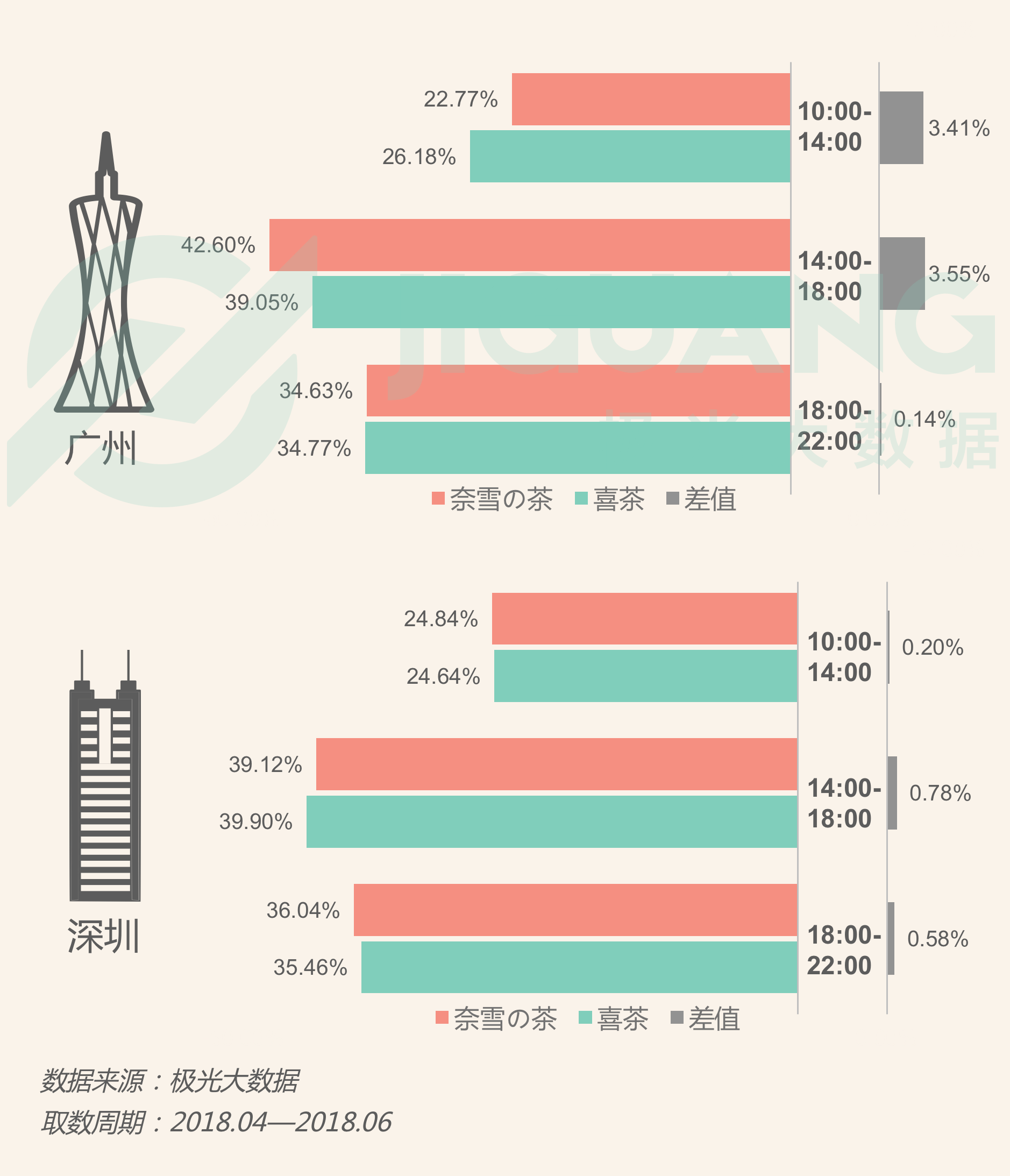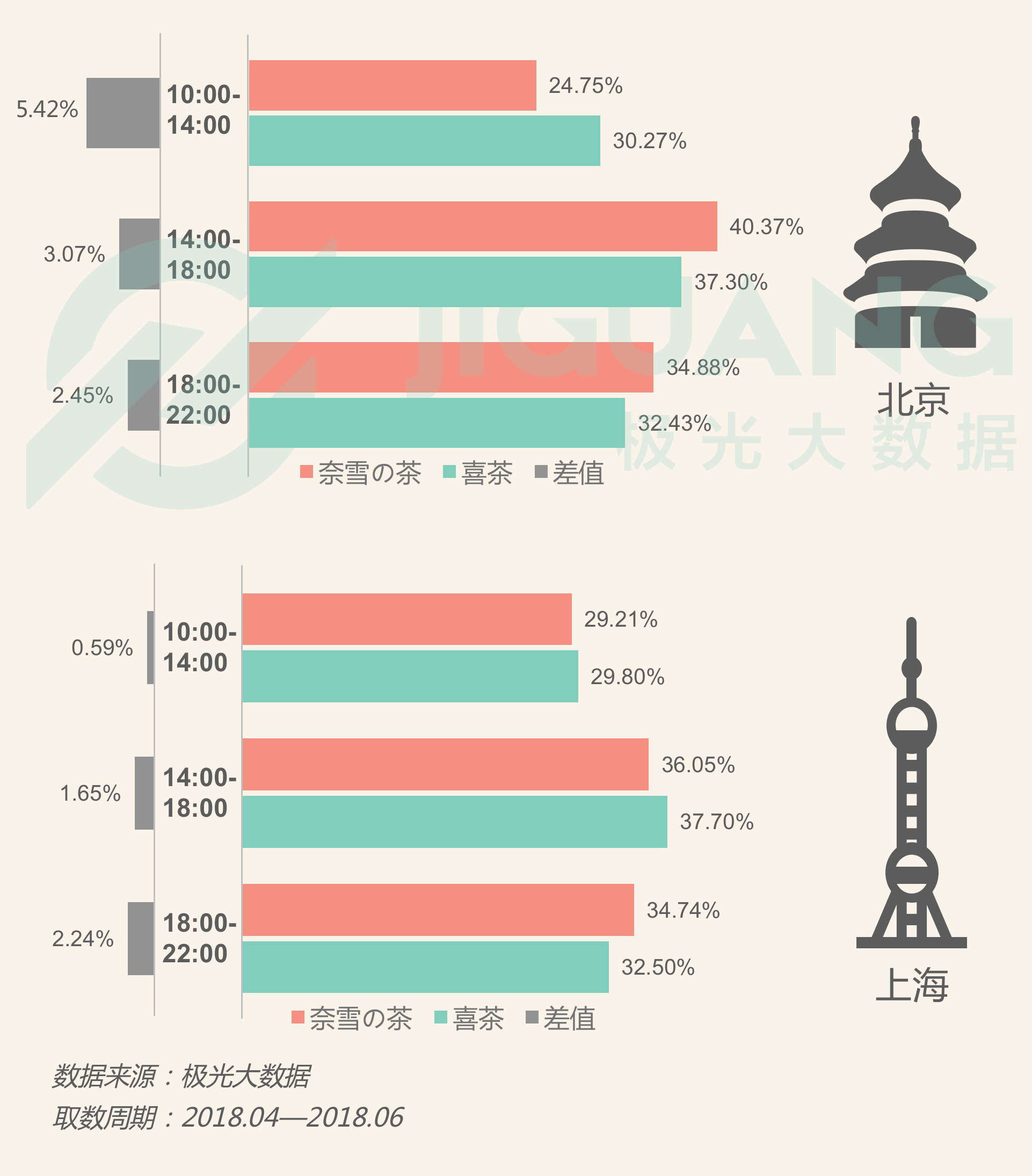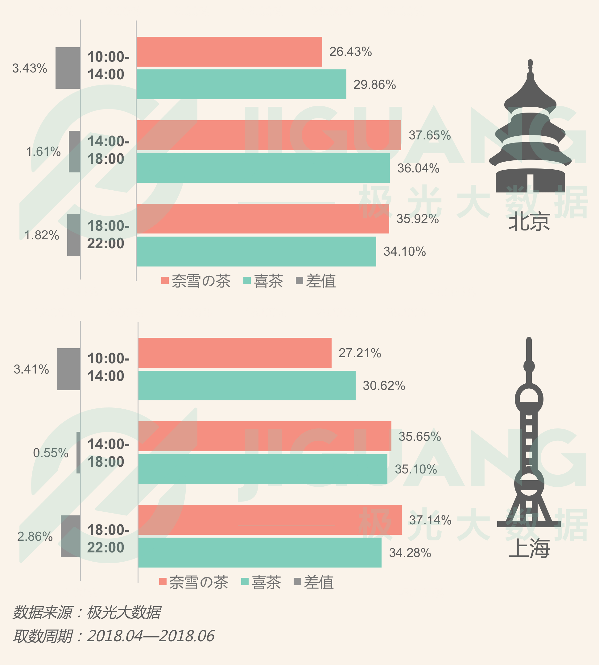 根据极光大数据统计,在北京和上海,喜茶人群更喜欢在快节奏的中午时段捎走一杯茶;而在悠闲自得的下午和繁忙一天后的晚上,奈雪の茶人群更喜欢品一杯茶。