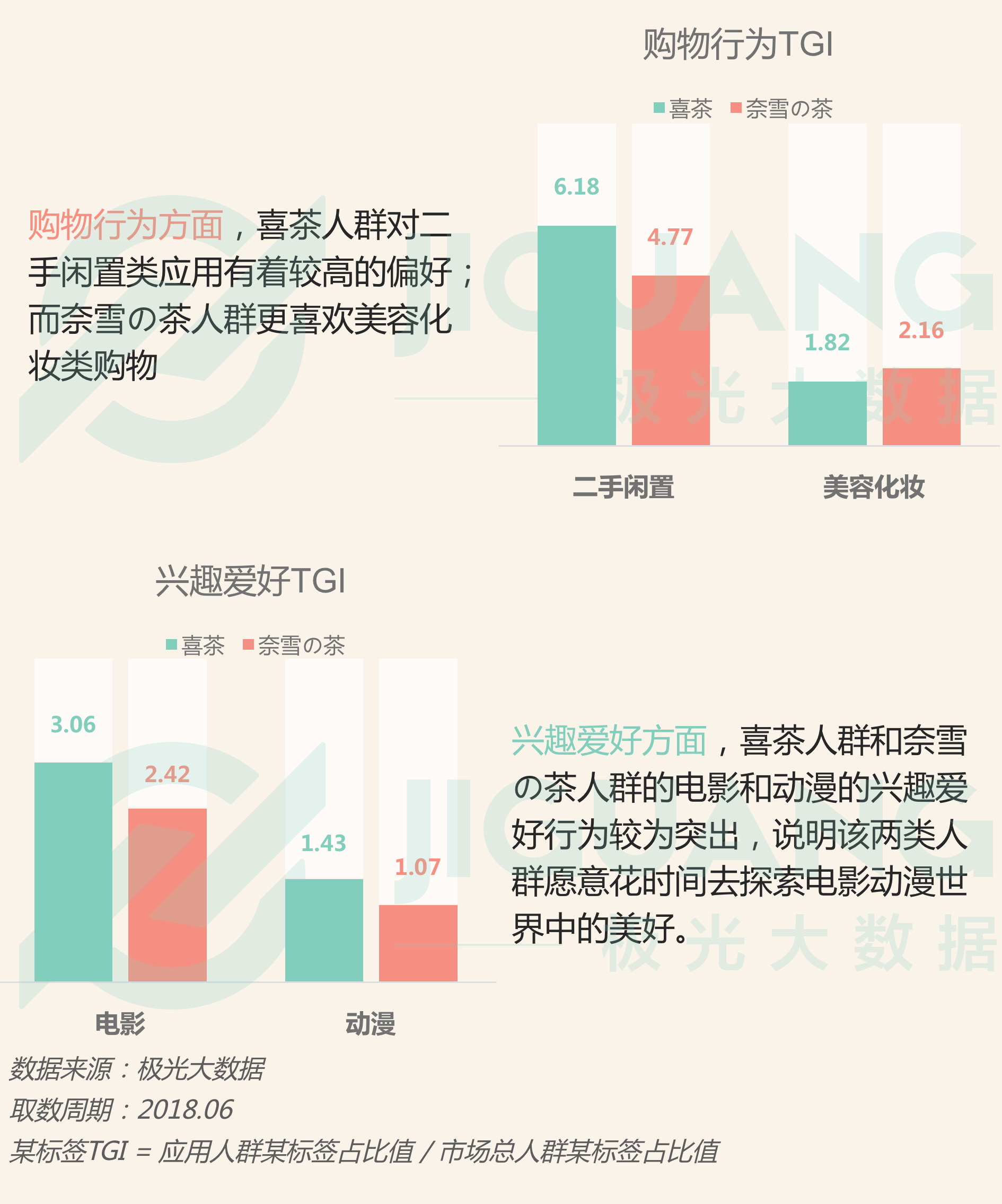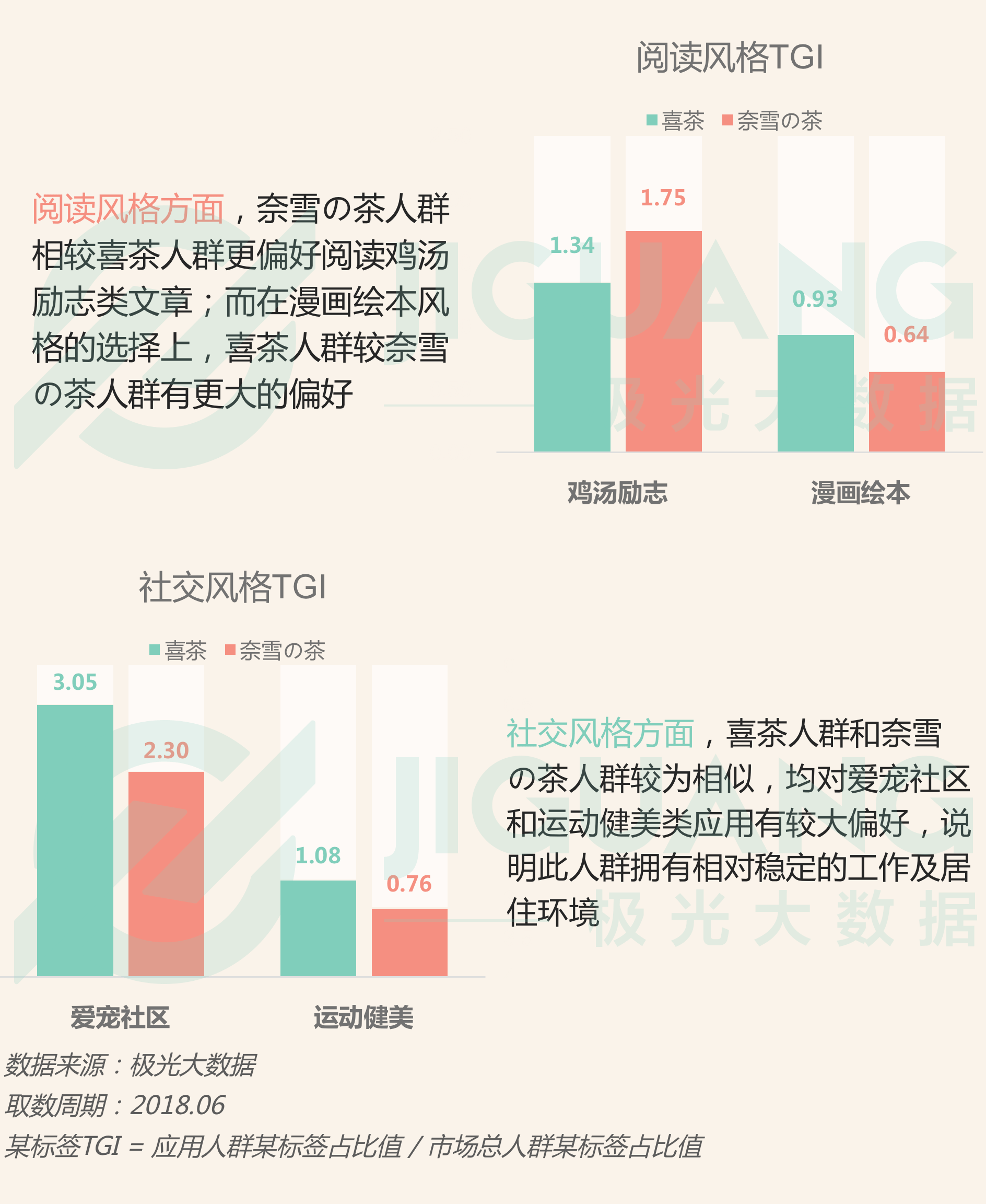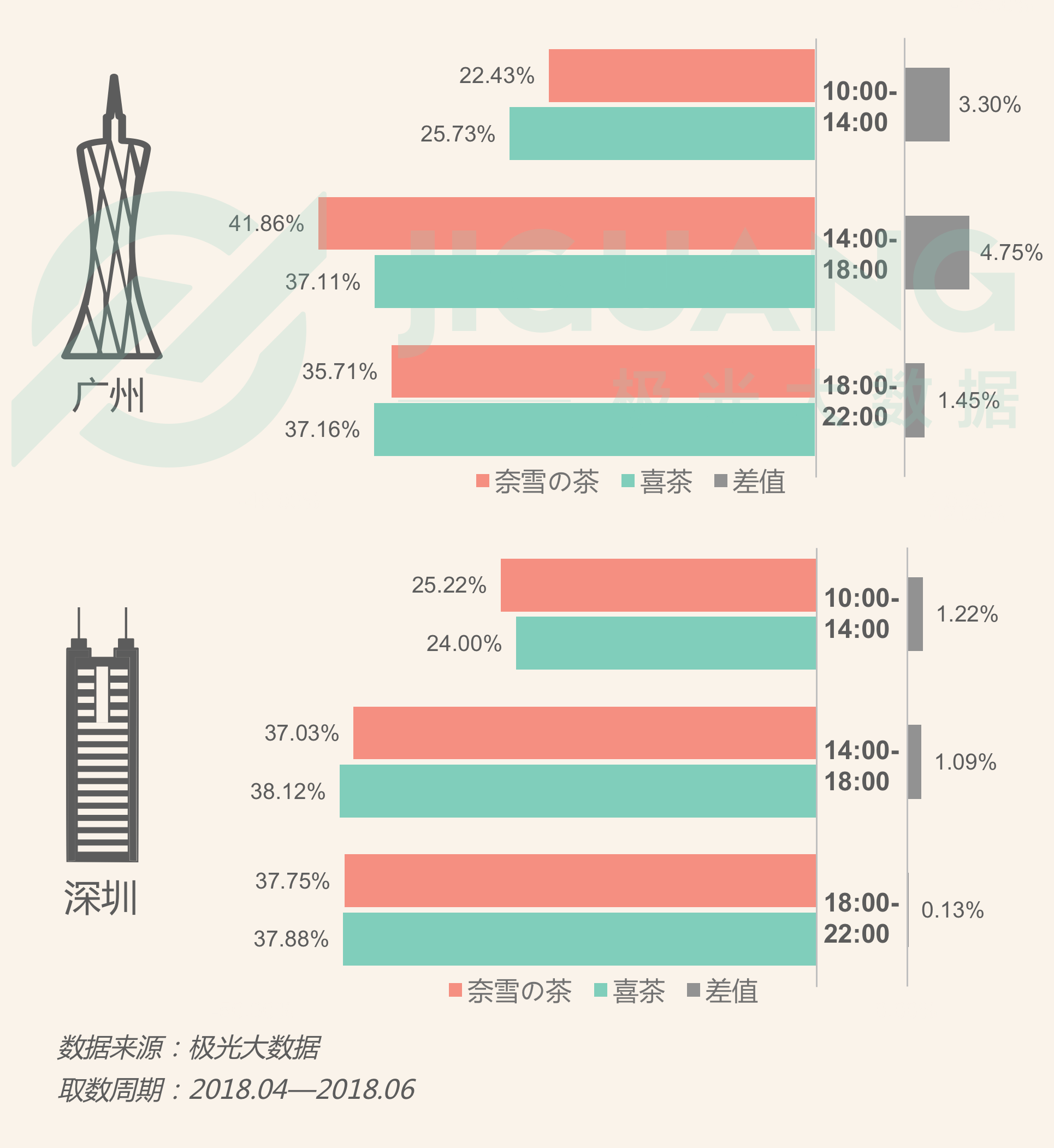 根据极光大数据统计,在北京和上海,喜茶人群更喜欢在快节奏的中午时段捎走一杯茶;而在悠闲自得的下午和繁忙一天后的晚上,奈雪の茶人群更喜欢品一杯茶。