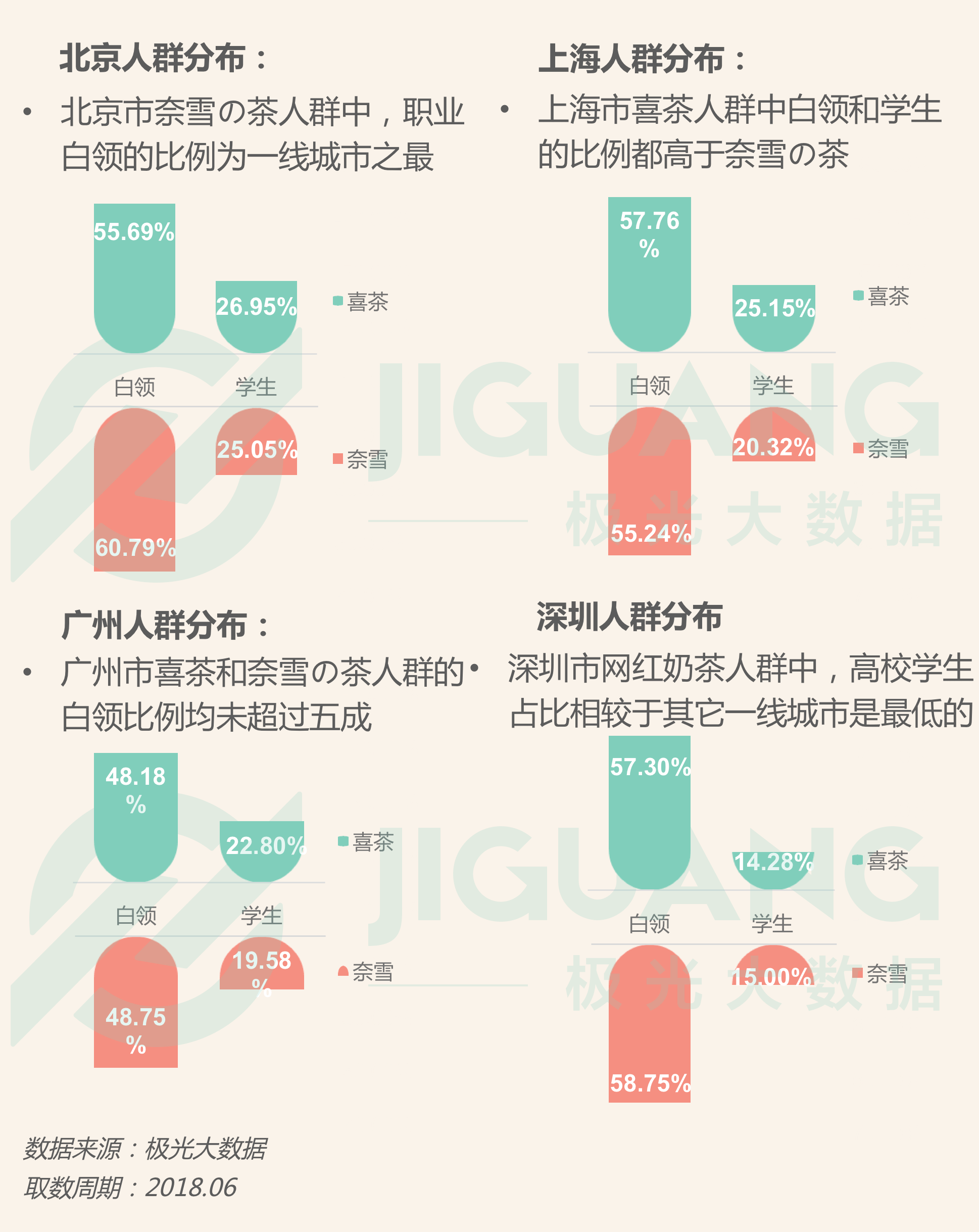 根据极光大数据统计,喜茶和奈雪の茶人群中一线城市白领占比基本过半:“不喜欢喝奶茶的白领不是好肥宅”。