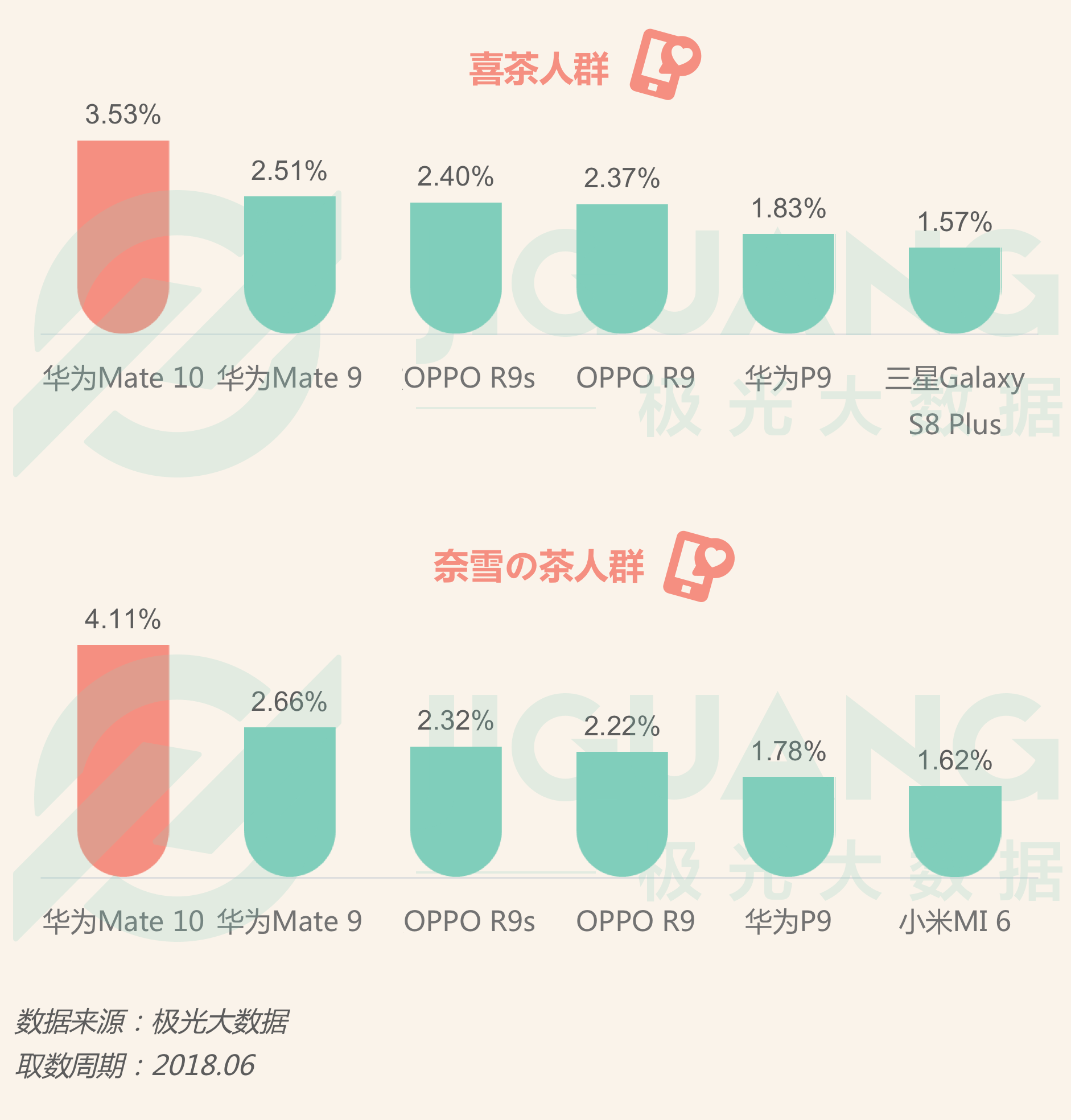 根据极光大数据统计,喜茶&奈雪の茶人群使用最多的安卓手机品牌是华为和OPPO。其中,华为Mate 10和Mate 9机型最受喜茶&奈雪の茶人群欢迎。