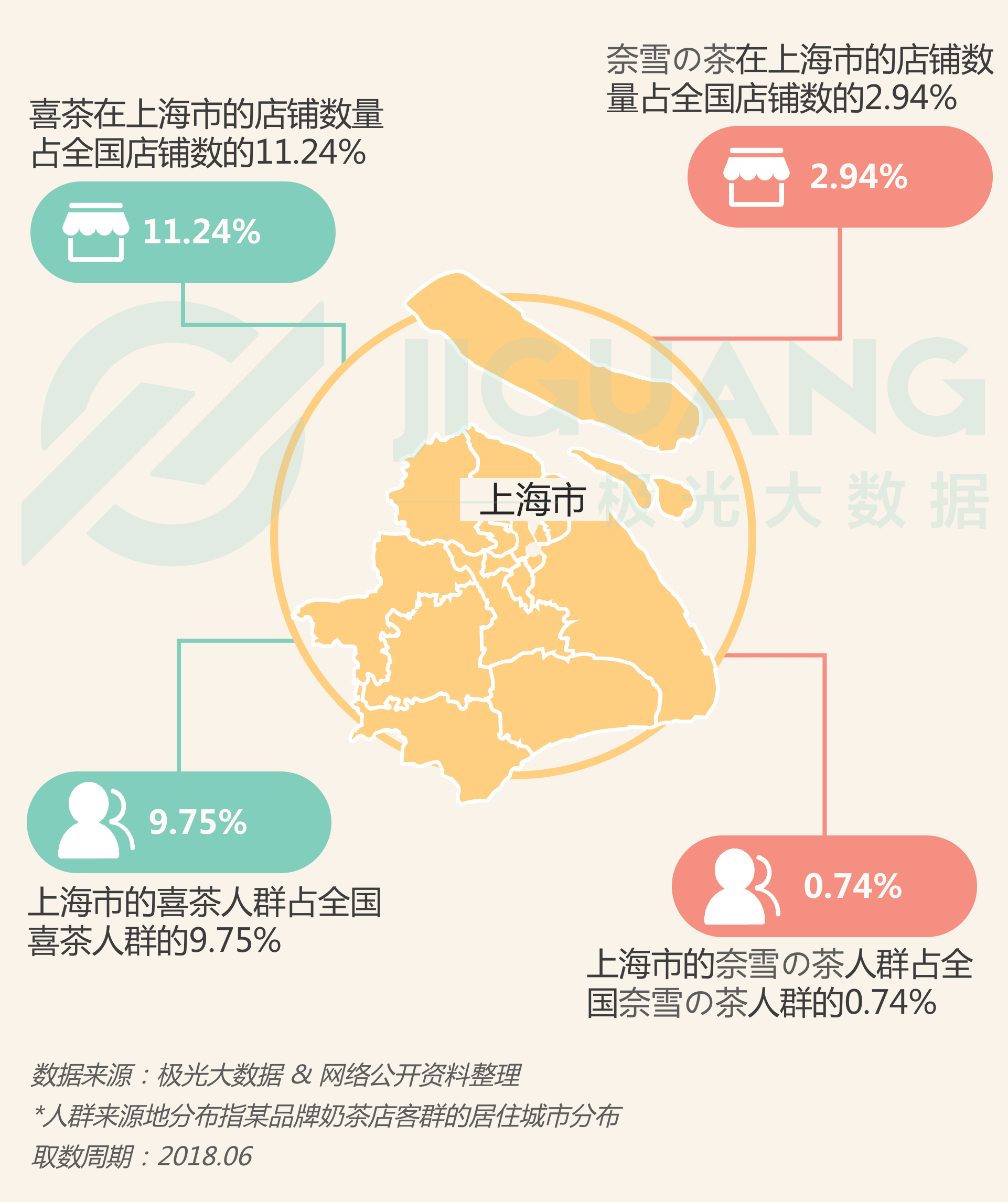 上海市坐拥全国客流量最大的喜茶店和奈雪の茶店,两大网红奶茶在上海极受追捧。