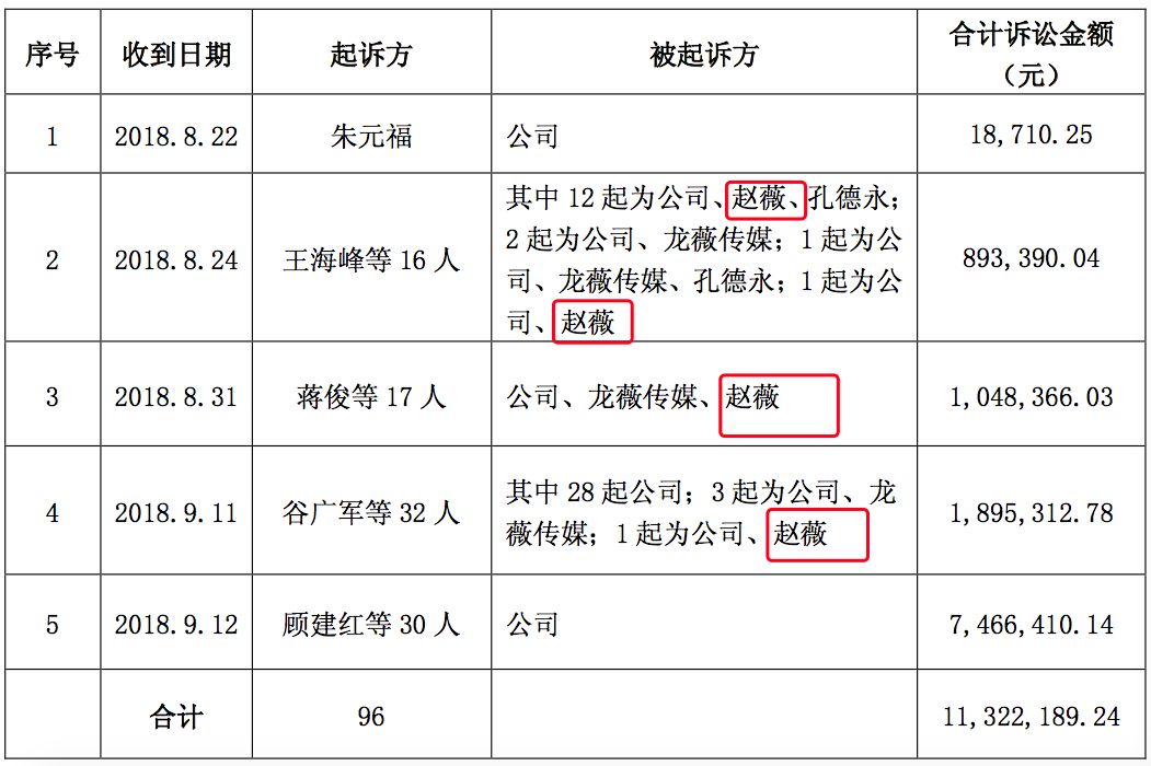 就在开庭前几天,祥源文化发布公告称,6月份以来,公司又陆续收到法院《应诉通知书》,涉及96起证券虚假陈述责任纠纷案件,诉讼金额共计人民币1132万元。而目前,已有440位投资者起诉公司,总计索赔5584.77万元,其中部分案件的被告还包括赵薇、龙薇传媒、孔德永等人。