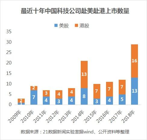 21数据新闻实验室梳理发现,2018年以来一共有29家互联网科技公司在境外上市,数量为史上最高。而此前最高记录为2014年的21家。那一年,微博、京东、迅雷、阿里巴巴纷纷登陆美股。阿里巴巴更是在上市首日成为仅次于谷歌的全球市值第二大互联网公司。