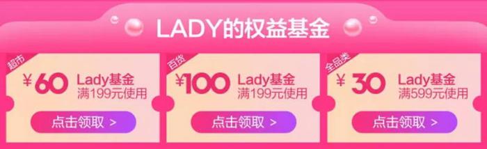 苏宁易购将每年的9月21日定为“Lady day”,推出“女王宠爱日”专场活动。本次活动的最大亮点是“LADY权益基金”,苏宁用真金白银让利女性,保护女性权益。Lady超市基金满199元减60;Lady百货基金满199元减100;Lady全品基金满599元减30。