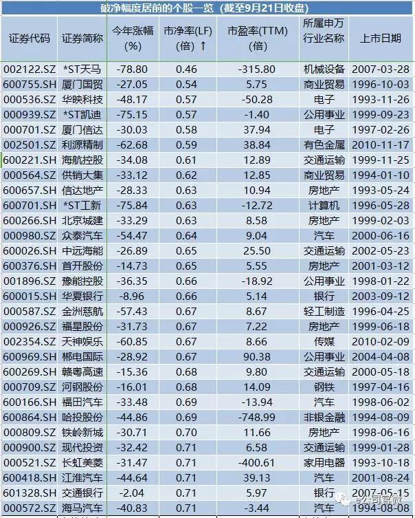 经过本周以来连续4天的反弹,一度逼近300只的破净股数量目前已明显缩减。Wind统计显示,截至9月21日收盘,A股市场破净股数量为245只。破净幅度超过四成的个股有6只,包括*ST天马、厦门国贸、华映科技、*ST凯迪、厦门信达和利源精制。通常被认为股价高估的创业板也有9只个股上榜,包括有华录百纳、联建光电、振东制药、南风股份等。