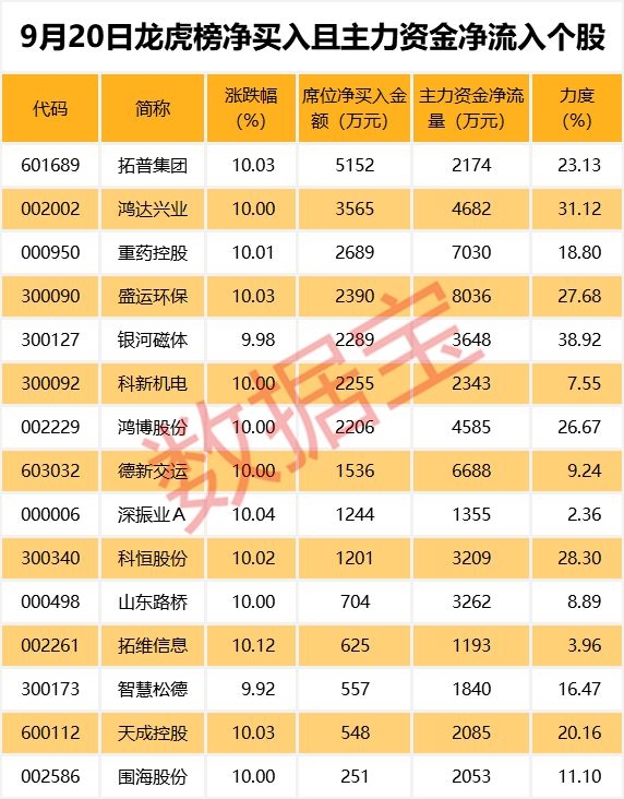 9月20日龙虎榜中机构及营业部席位资金净卖出3.88亿元,其中净买入的个股有16只;净卖出的个股有19只。净买入前三名个股分别是拓普集团、鸿达兴业、重药控股,净买入金额占当日成交额比例达54.83%、23.69%、7.19%。