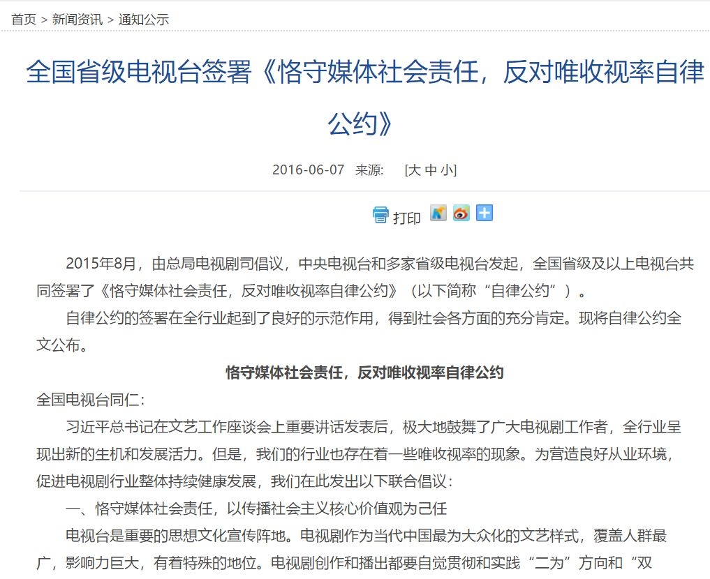 记者注意到,2015年8月,由广播电视总局电视剧司倡议,中央电视台和多家省级电视台发起,全国省级以上电视台共同签署了《恪守媒体社会责任,反对唯收视率自律公约》,其中倡议“电视剧购播工作……不搞唯收视率论,更不能搞以收视率定价。各家电视台承诺:自本公约发布之日起,在电视台购销合同中不签订以收视率和以收视率排名定价、议价的条款。”