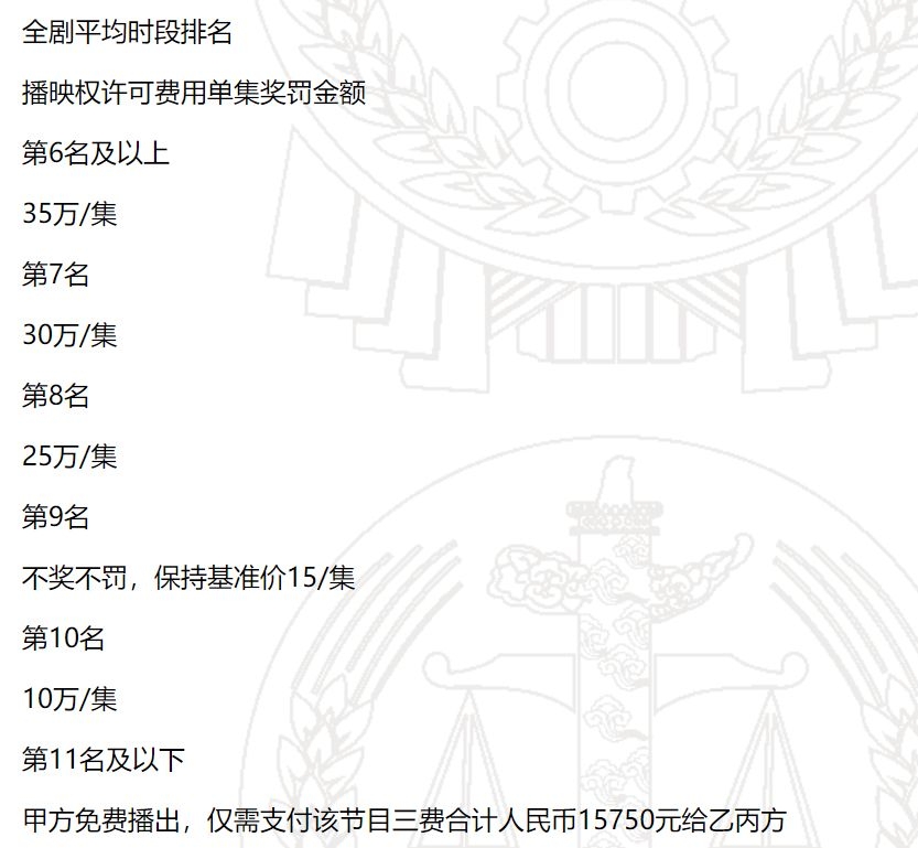 达到第6名及以上,每集35万元,此后收视每下降一名,单集费用递减5万元,到第9名不奖不罚,保持基准价15万/集;第10名,10万/集;第11名及以下,电视台免费播出,仅需支付该节目的三费(即“专业蓝光盘、邮寄费和复录费”)约一万五千元。