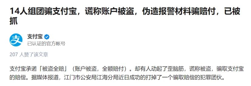 其实,谎称账户被盗骗取理赔的案例并不少见。小编注意到,在知乎问答中,支付宝官方账号甚至亲自“上阵”,在回答中列举了媒体报道的骗赔案例。
