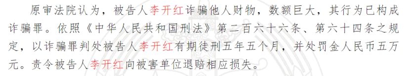 不过事情很快有了反转,2018年9月19日,江苏省无锡市中级人民法院发布终审(二审)判决文书,李某因诈骗罪获刑5年零5个月,处罚金5万元,同时被责令向被害单位退赔损失。